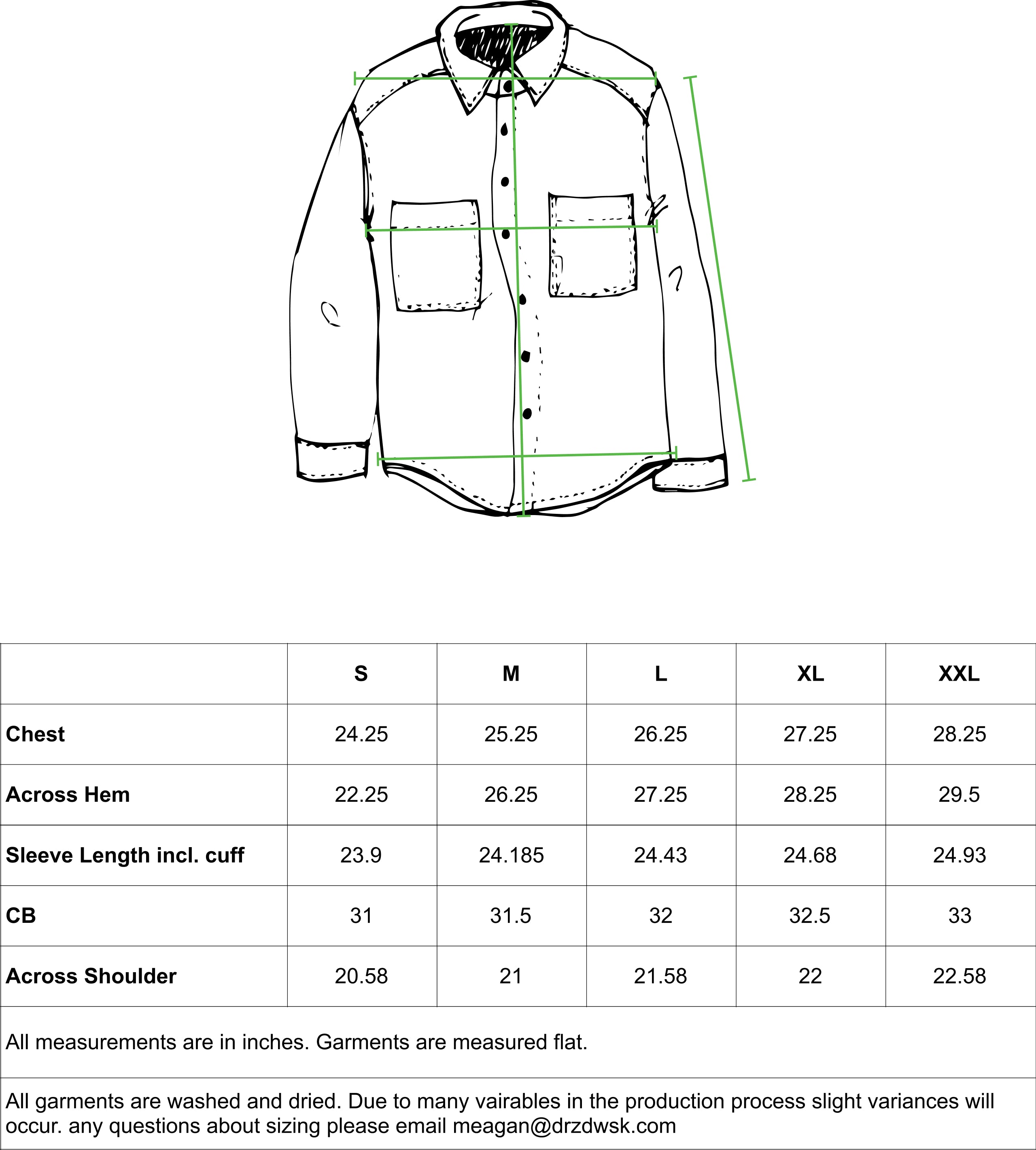 Features: Curved hem, curved sleeve cuffs, two cross grain chest pockets, back box pleat, two piece flat felled sleeve and armhole and genuine pearl buttons