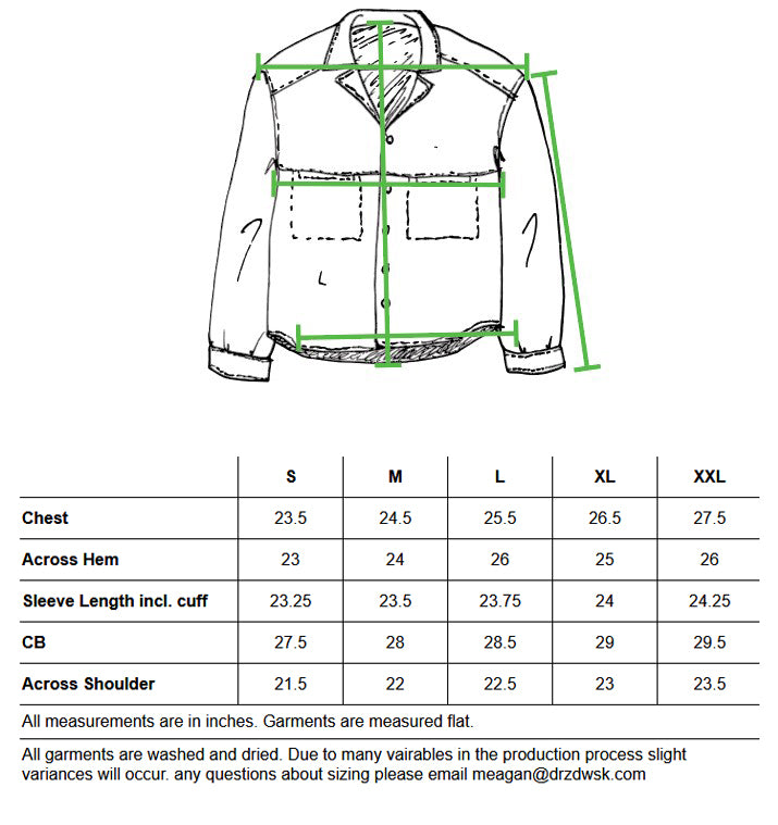 Features: Camp collar, drop shoulders, subtle curved hem, two inseam chest pockets, back box pleat, curved sleeve cuff, blind stitch finish on chest seam and pocket facing, with black corozo buttons.
